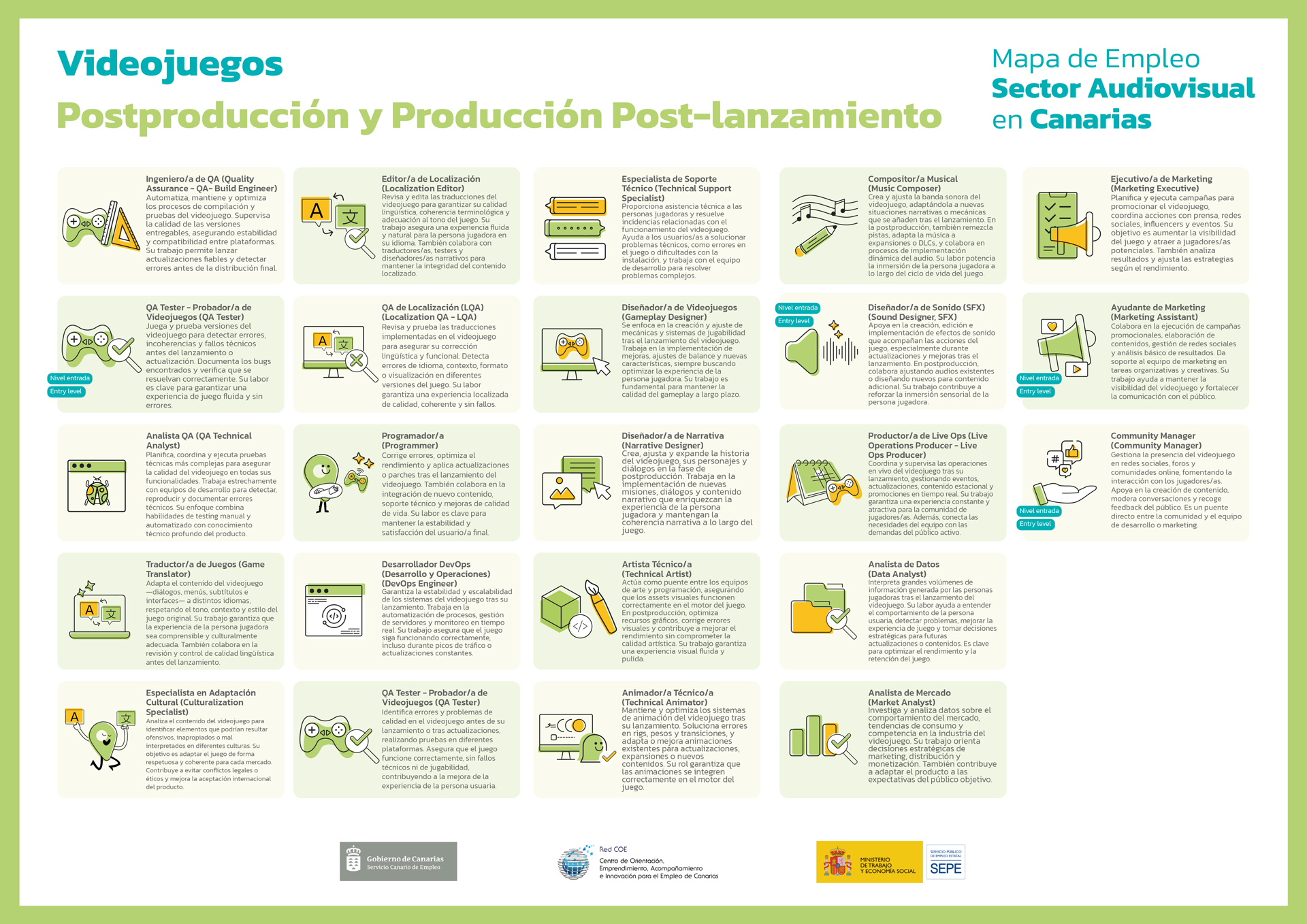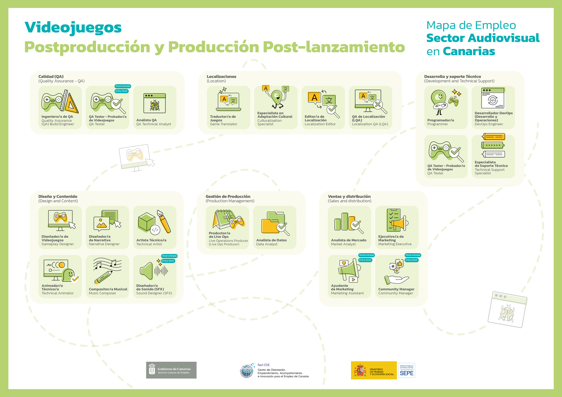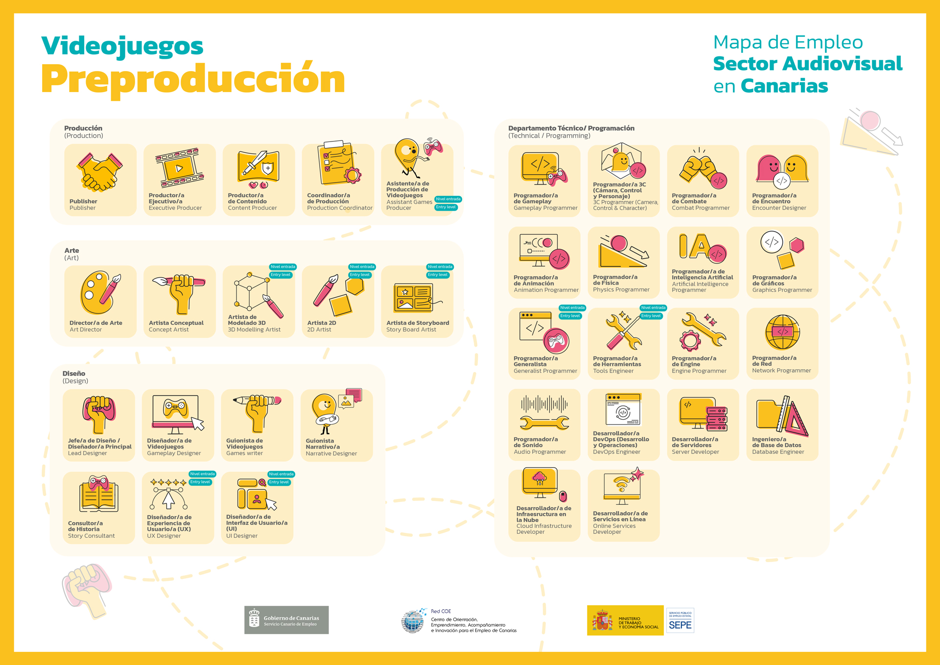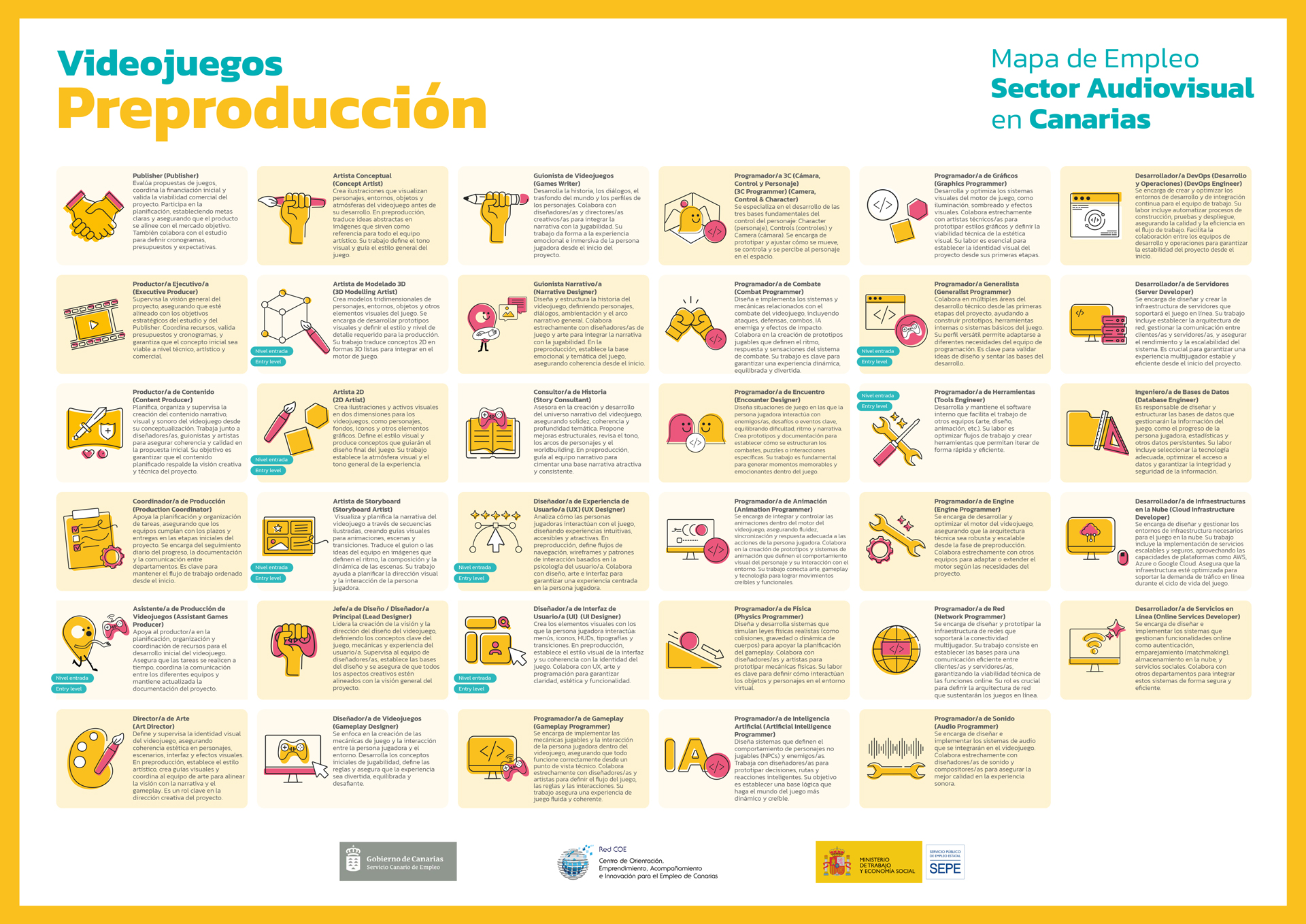 Diseñar 14 Mapas de Empleo con todas las profesiones y departamentos integrados en las áreas de Videojuegos y FX, incluyendo 171 elementos identificativos, 171 fichas, 2 Manuales y 1 Folleto.